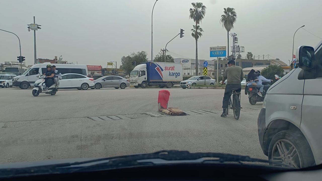 Her gün binlerce binek aracın, ağır vasıtanın ve motosikletlinin kullandığı işlek kavşakta; açık kalan çukura araçların düşmesini engellemek amacıyla akılalmaz bir yola başvurulduğu görüldü. Yolun ortasındaki tehlikeli noktaya uyarı levhası veya nizami bir duba yerine; eski bir rulo halı parçası ve kırmızı bir kılıf geçirilmiş taş yerleştirilmesi faciaya davetiye çıkardı.