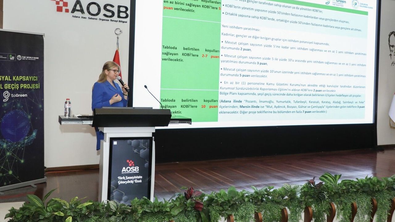Çukurova Kalkınma Ajansı iş birliğiyle düzenlenen etkinlikte, Sanayi ve Teknoloji Bakanlığı koordinasyonunda ve Dünya Bankası finansmanıyla hayata geçirilen "2026 Yılı Sosyal Kapsayıcı Yeşil Geçiş (SoGreen) Geri Ödemeli Finansman Desteği Programı" tüm detaylarıyla Adanalı sanayicilere tanıtıldı.