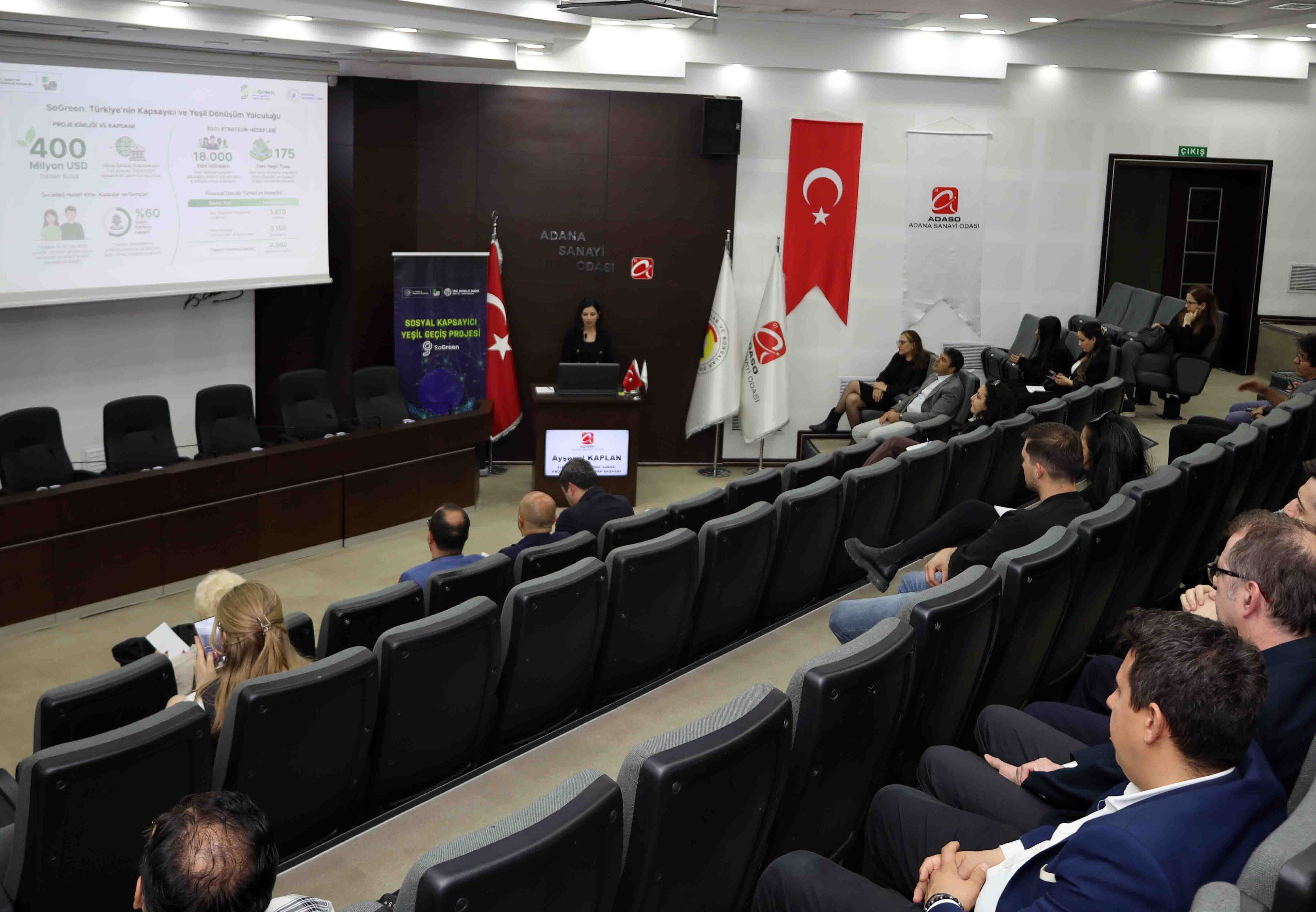 Sanayi ve Teknoloji Bakanlığı Kalkınma Ajansları Genel Müdürlüğü ile Dünya Bankası ortaklığında hayata geçirilen Sosyal Kapsayıcı Yeşil Geçiş (SoGreen) Projesi, Adana Sanayi Odası’nın ev sahipliğinde gerçekleştirilen kapsamlı bir toplantıyla sanayicilere tanıtıldı. Sakıp Sabancı Konferans Salonu’nda düzenlenen programa bölgedeki çok sayıda iş insanı ve sanayici katılım sağladı.