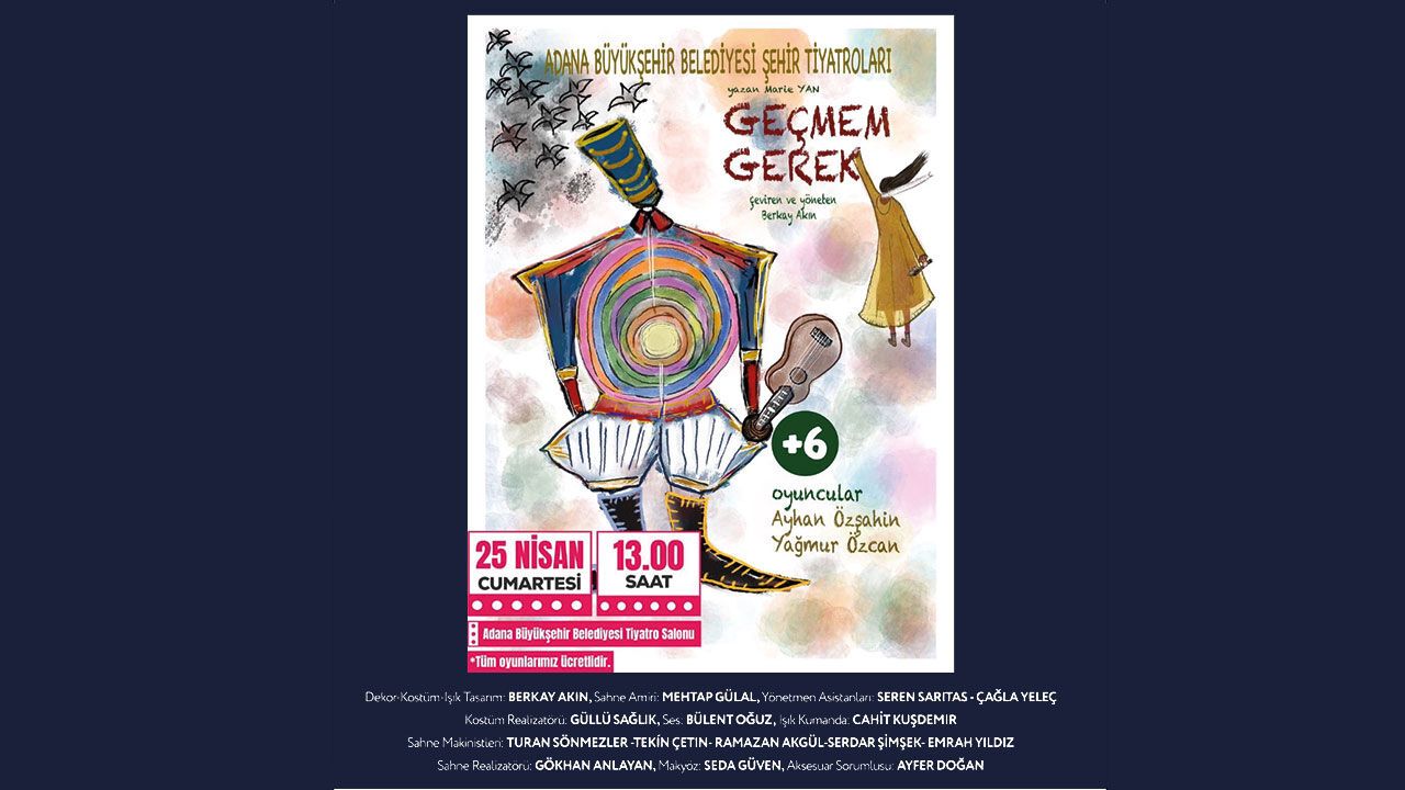 Oyun, 25 Nisan Cumartesi günü saat 13.00’te, Adana Büyükşehir Belediyesi Tiyatro Salonu’nda sahnelenecek. Tiyatro yetkilileri, tüm sanatseverleri oyunu izlemeye davet etti.