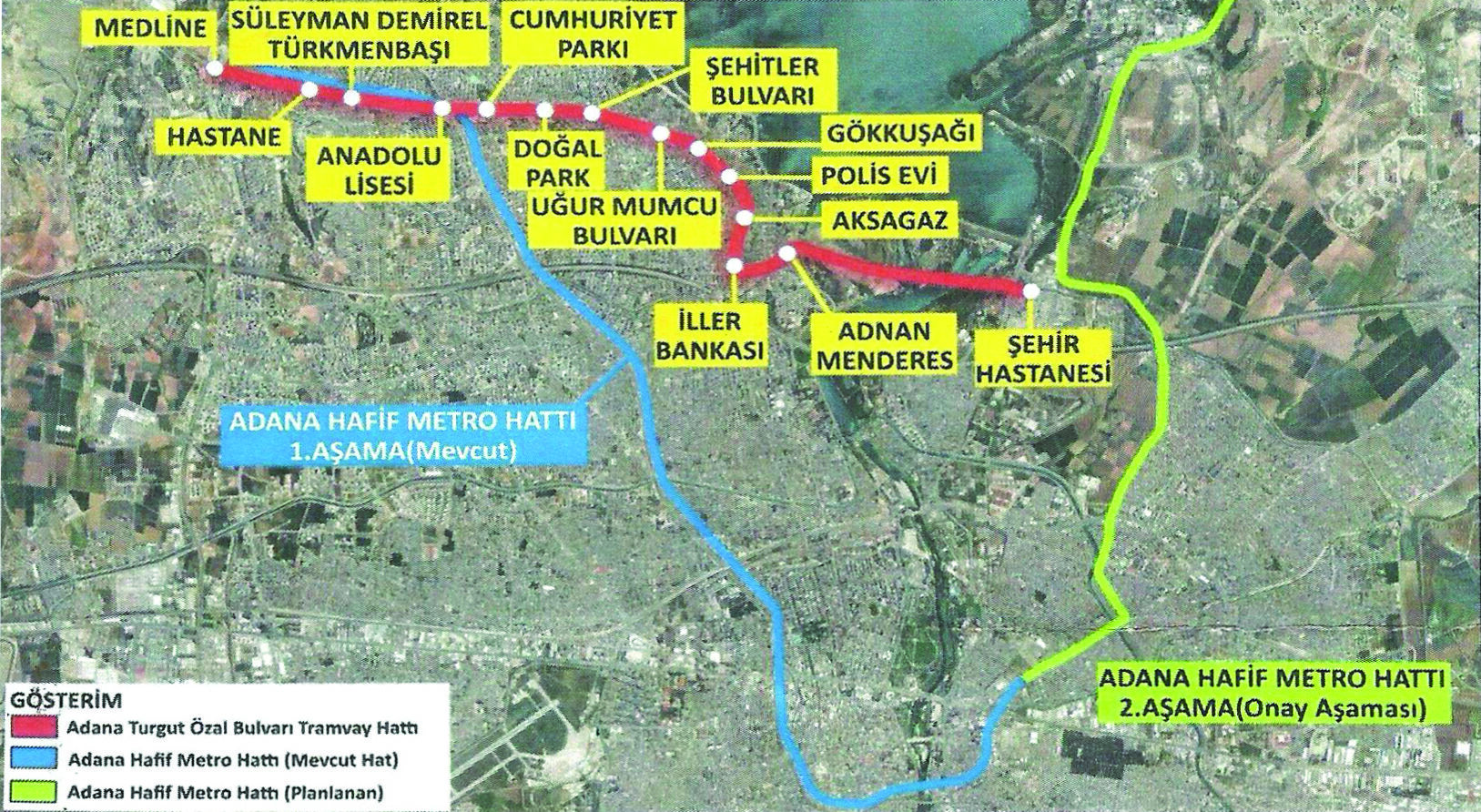Avrupa İmar ve Kalkınma Bankası (EBRD) tarafından finansmanı kısmen ya da tamamen sağlanacak olan proje, Adana Ulaşım Ana Planı kapsamında planlanan beş yeni tramvay hattının ilki olacak. 10 kilometre uzunluğundaki hat, Medline Hastanesi’nden başlayıp Şehir Hastanesi’nde sonlanacak ve toplam 14 istasyondan oluşacak. Proje hayata geçirilirse; Turgut Özal Bulvarı boyunca sırasıyla Hastane, Süleyman Demirel/Türkmenbaşı, Anadolu Lisesi, Cumhuriyet Parkı, Doğal Park, Şehitler Bulvarı, Uğur Mumcu Bulvarı, Gökkuşağı, Polis Evi, Aksagaz, İller Bankası ve Adnan Menderes istasyonları yer alacak.