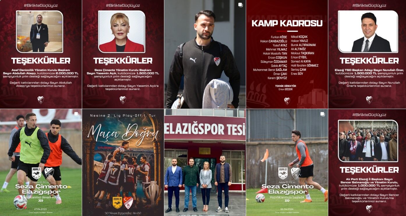 Elazığspor'a play-off maçları öncesi şehirden büyük destek geliyor. Elazığlı iş insanları ve firmalar Bordo-Beyazlı kulüp için şampiyonluk primleri açıklarken, rakam kısa bir sürede 13 milyon TL'yi geçti. Kafile ise Adana’ya hareket etti.