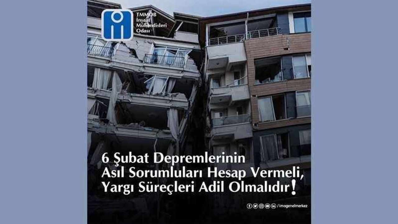 6 Şubat’ta yaşanan Kahramanmaraş merkez üslü deprem felaketinin ardından yıkılan binaların yapımında usulsüzlük belirlenen ve sorumlarının yargılandığı davalarda adil bir yargılama olmadığını ve gerçek sorumluların tespiti noktasında doğru adımlar atılmadığını dile getiren TMMOB İnşaat Mühendisleri Odası Yönetim Kurulu yaptığı yazılı açıklamada, “Yıkımının sorumluluğunu meslektaşlarımızın üzerine yıkıp, gerçek sorumluların gizlenmesi çabalarına en yüksek sesle itiraz ediyor, gerçek ve adil bir yargılama talep ediyoruz.” ifadelerini kullandı.