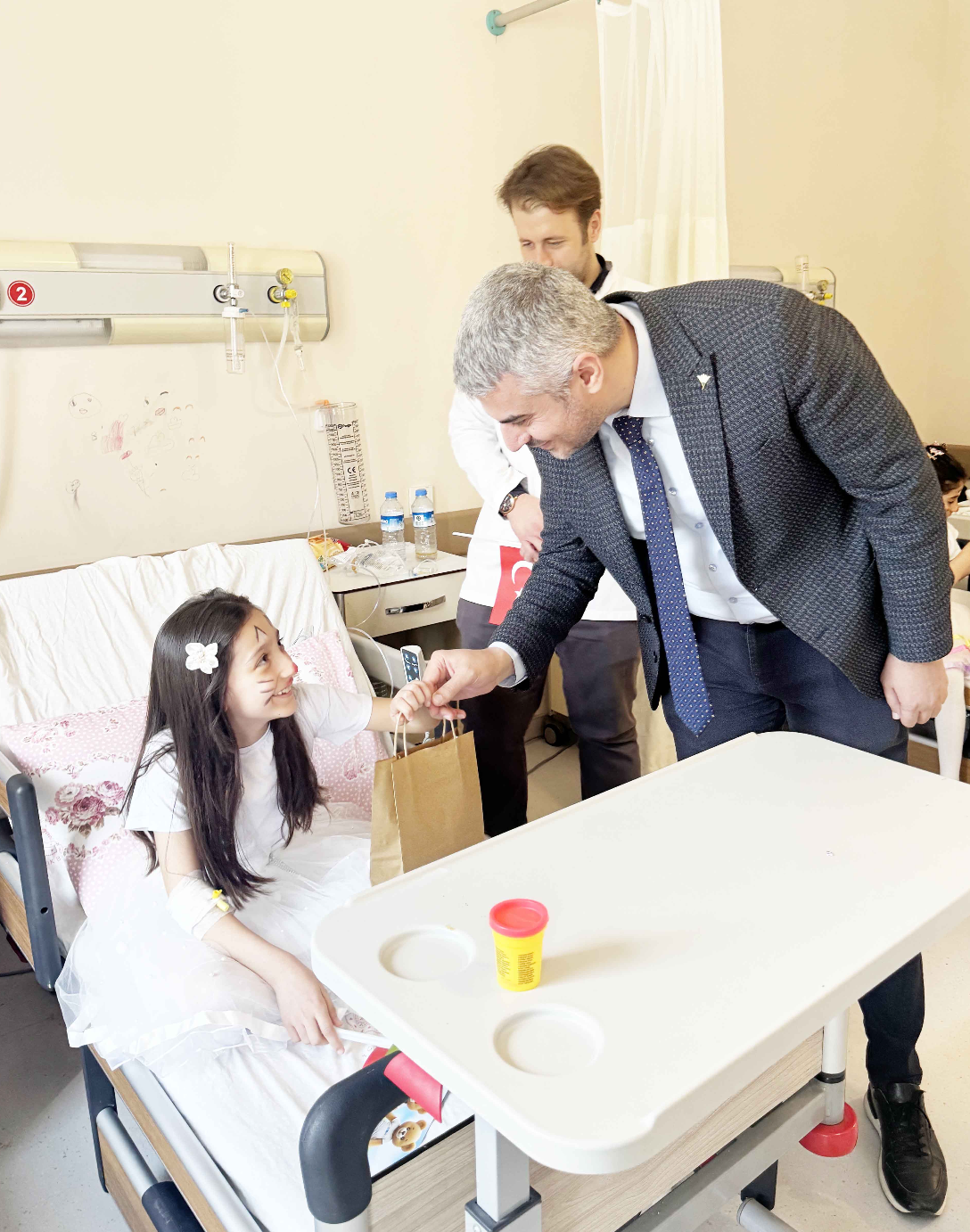 Tedavi süreçleri devam eden minik hastalar, Başhekim Uzm. Dr. Fatih Tepe ve hastane yönetiminin sürpriz ziyaretiyle bayram sevincini doyasıya yaşadı.