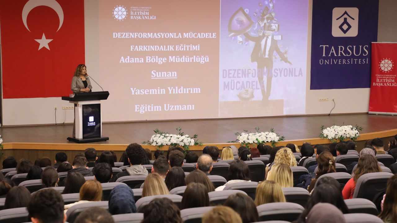 Adana Bölge Müdürlüğü Eğitim Uzmanı Yasemin Yıldırım tarafından verilen sunumda, dezenformasyonun oluşum süreçleri ve toplumsal etkileri hakkında bilgi paylaşılırken, dijital ortamlarda doğru bilgiye erişim yolları anlatıldı.