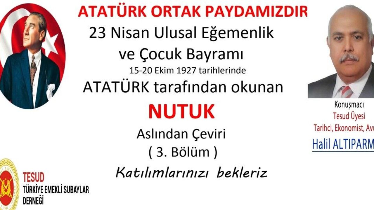Bu anlamlı etkinliği diğer anma programlarından ayıran en önemli detay ise sunumun kaynağı olacak. TESUD Üyesi Tarihçi, Ekonomist, Köşe Yazarı ve Avukat Halil Altıparmak; 15-20 Ekim 1927 tarihlerinde bizzat Gazi Mustafa Kemal Atatürk tarafından okunan Nutuk'un ilk basım durumunu, yani Arap harfleriyle yazılı orijinal Osmanlıca nüshasını aslından çevirerek katılımcılarla paylaşacak.