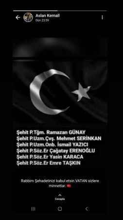 Şehit Aslan’ın son whatsapp durumu ise görenleri duygulandı. Şehidin söz konusu durumdaki paylaşımda, 6 şehidin isimlerini tek tek yazarak, "Rabbim şehadetinizi kabul etsin. Vatan sizlere minnettar” yazdığı görüldü. Paylaşımın ardından kendisi de bir gün sonra vatan için şehit düştü.